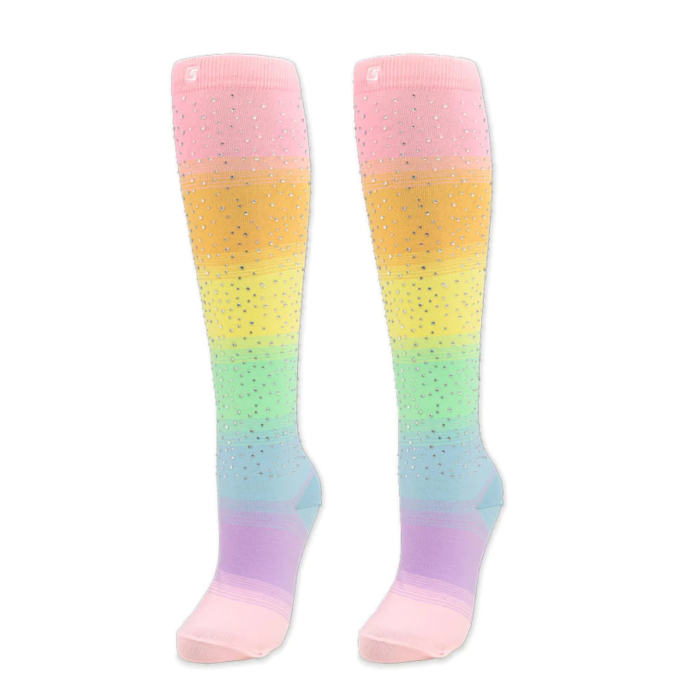 A knee-high athletic sock with studded with diamonds!!!! These beautiful rainbow fade socks are as long lasting as they are fun to wear!