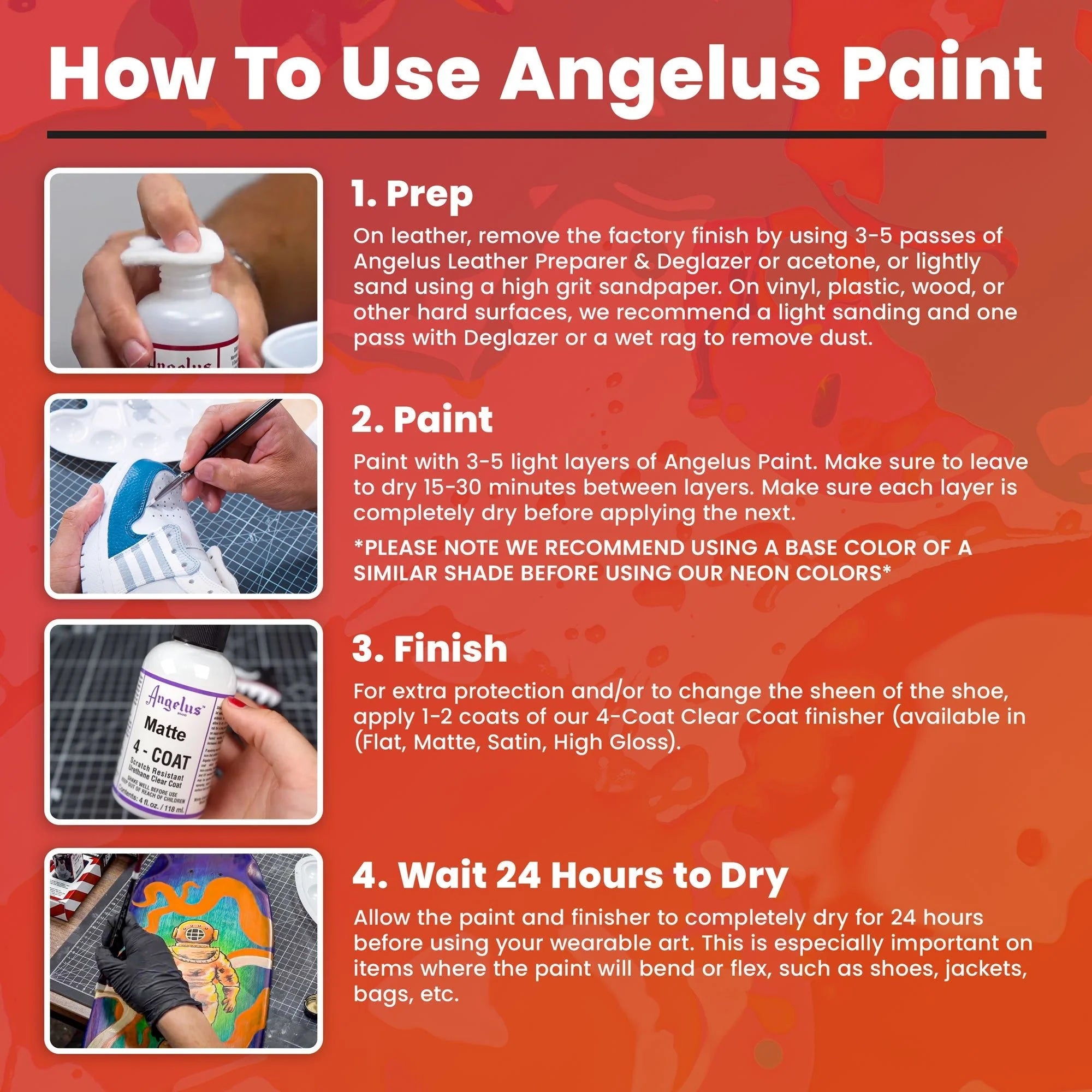 Angelus acrylic leather paint is the highest quality paint for your leather projects and is the perfect to customise and restore your skate boots, shoes, or any leather item.