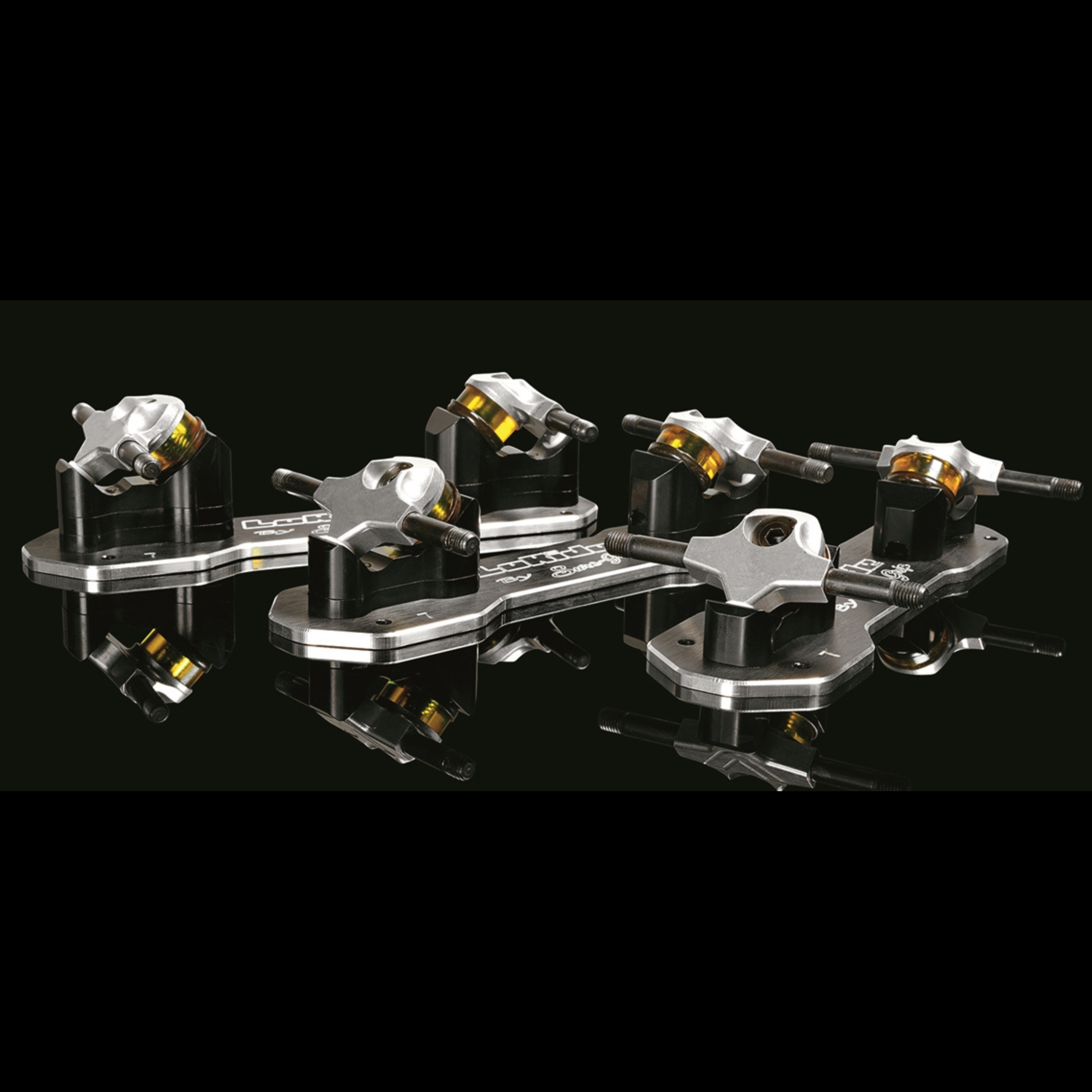 Once the desired hanger setup is installed you can begin to assemble the truck. The truck assembly is similar to a single action setup. cushion cup > cushion > truck > kingpin > kingpin nylon screw.