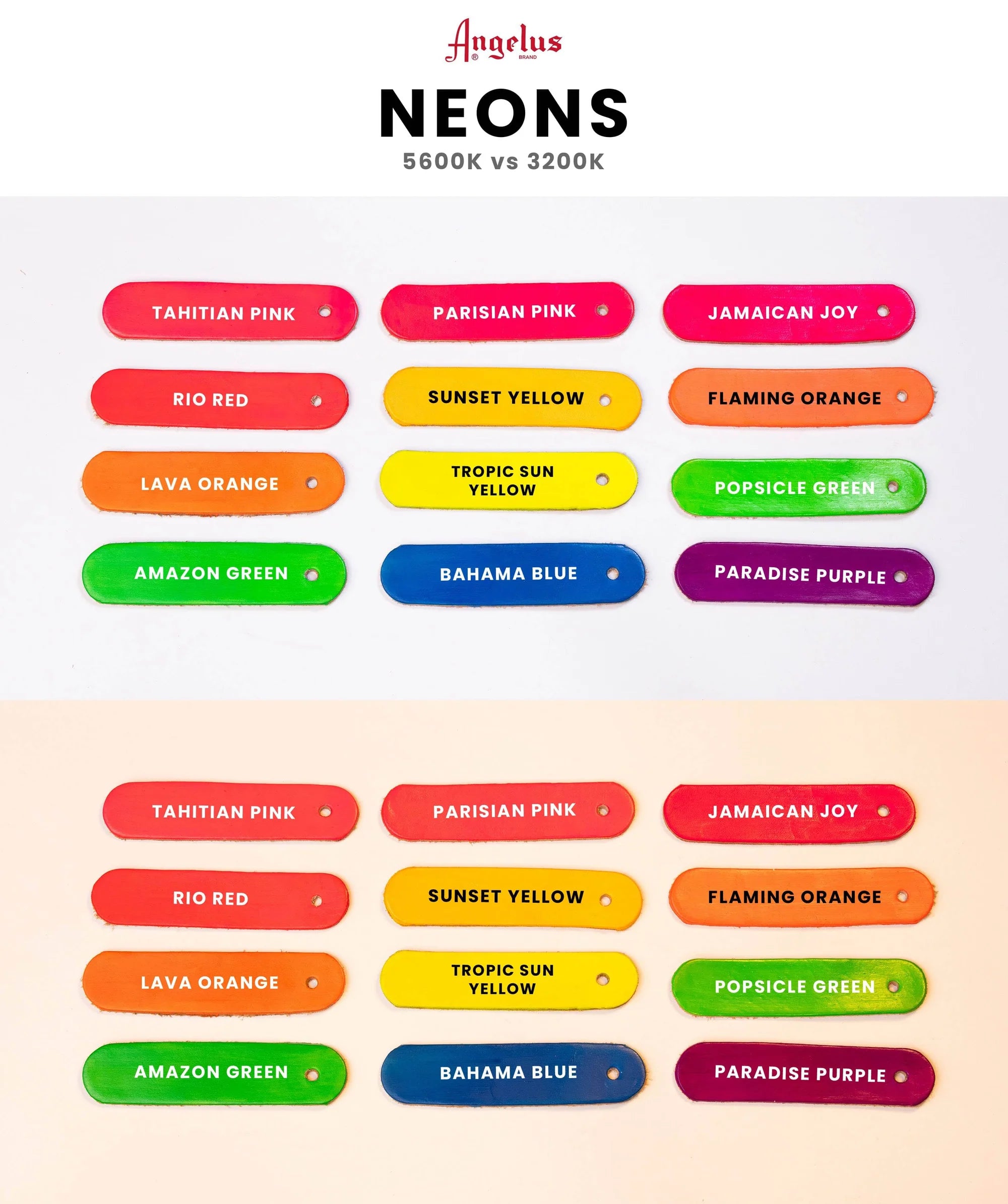 Angelus Neon color box kit. Contains 12 1oz/29.5ml Neon Acrylic leather paints.
