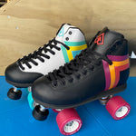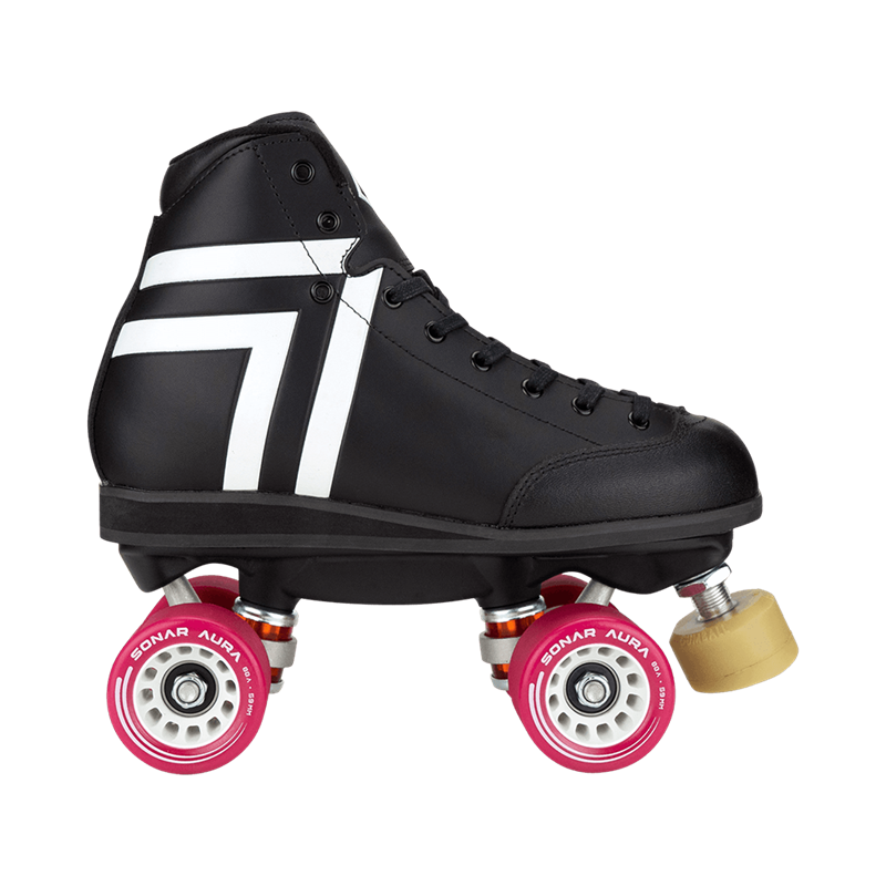 The Skyhawk Indoor features the comfortable riding Skyhawk boot with its vinyl upper, abrasion-resistant leather toe piece and shock-absorbing EVA heel. Fully assembled and ready to roll, this Skyhawk build rides on the PowerDyne Thrust nylon plate, Sonar Aura indoor wheels, ABEC-5 bearings and PowerDyne Adjustable Black toe stops.