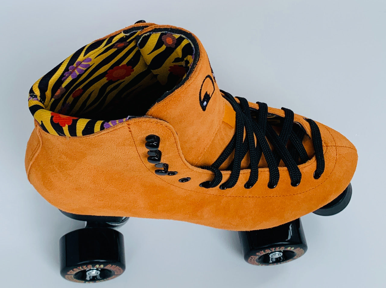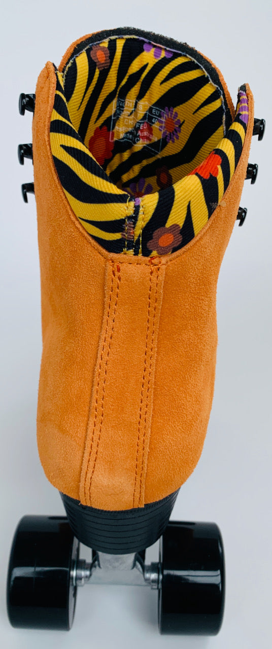 These tiger orange skates are part of our Chuffed Crew collection and are inspired by the very groovy Sophie Pizzuto. She might seem shy, but inside there is a wild skate animal just waiting for night to fall so it can be unleashed. The orange suede outer is contrasted against a black sole, eyelets, and laces, while inside there is a 70’s inspired animal print lining with flower decals for ultimate nostalgic vibes. The boot is padded with our cloud-like foam lining to deliver supreme comfort right out of the box. That’s right, zero break in period!