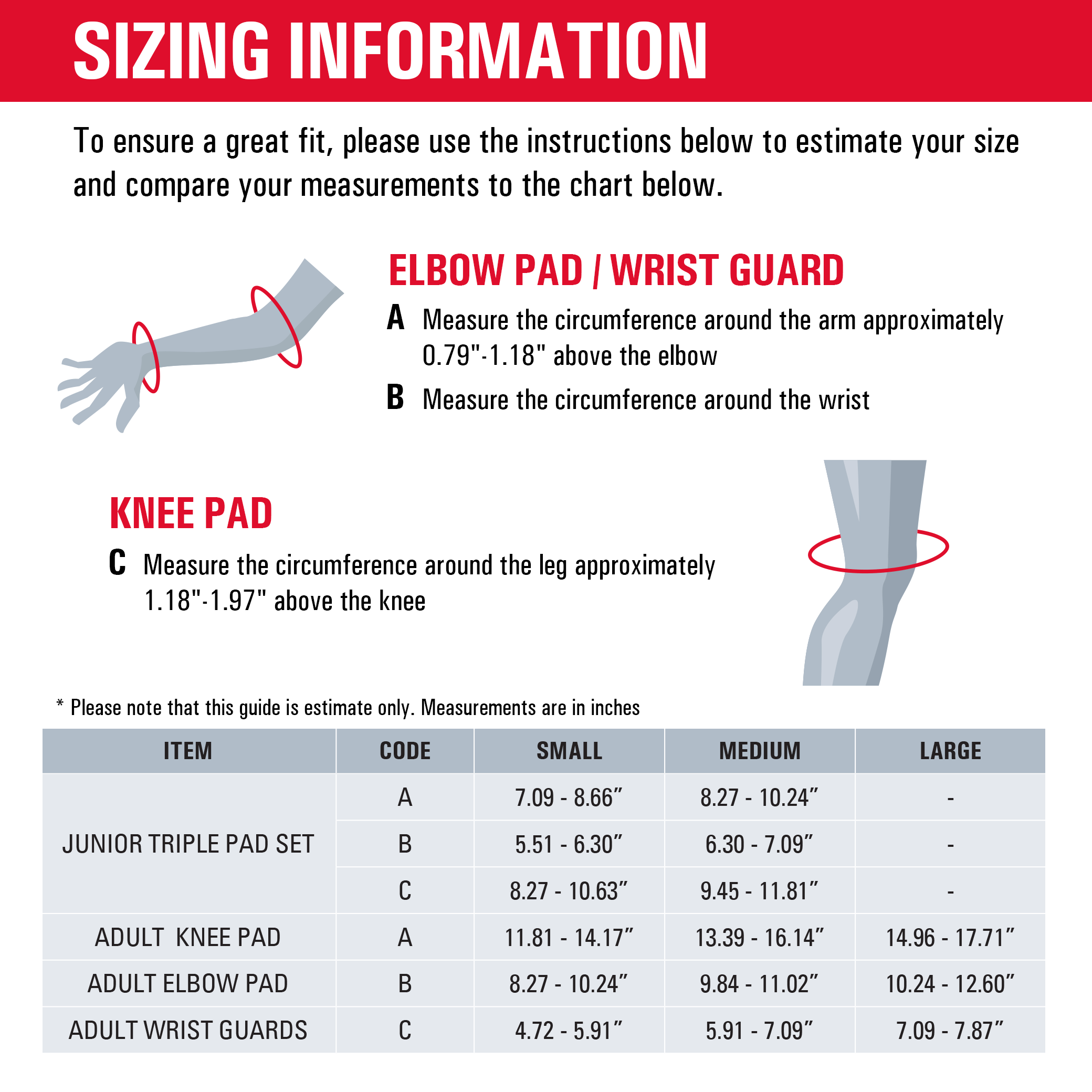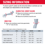 Consult the sizing chart for elbow pads in the image section below.