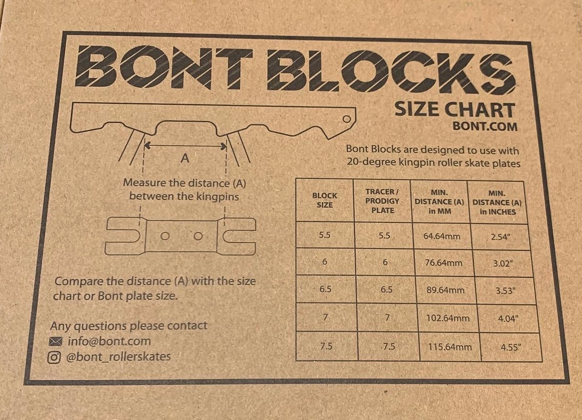 The Bont Block size matches the Tracer/ Prodigy plate size. For example, if you have a size 6.5 Tracer plate, you will need a 6.5 Bont Block. You can find the plate size on the plate near the back pivot cup. Note: Plate size is different to boot size.