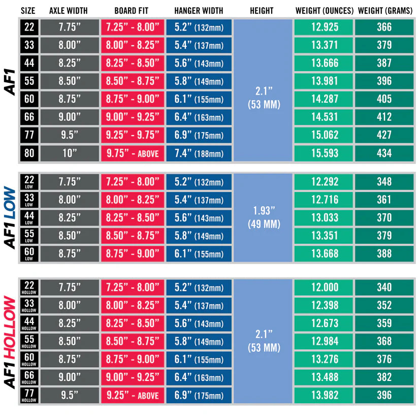 The ACE AF1 features game-changing performance without deviating from our original Ace geometry. The AF1 is carefully manufactured using our proprietary casting process. Years in development, the ACE AF1 has a 70% increase in the aluminum’s structural integrity, making it the strongest and longest lasting cast truck on the market.