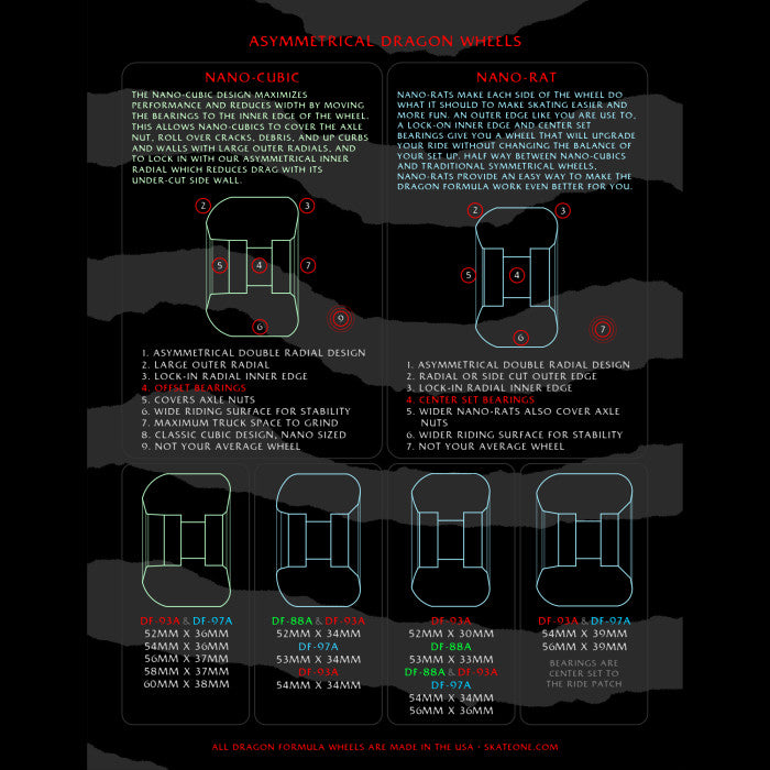 Nano-Rats make each side of the wheel do what it should to make skating easier and more fun. An outer edge like you are use to, a lock-on inner edge and center set bearings give you a wheel that will upgrade your ride without changing the balance of your set up. Half way between Nano-Cubics and traditional symmetrical wheels, Nano-Rats provide an easy way to make the Dragon Formula work even better for you.