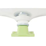Krux Marbie Miller K5 DLK trucks show her own unique artwork style on white hanger with teal green baseplate, white cushions, and silver hardware.