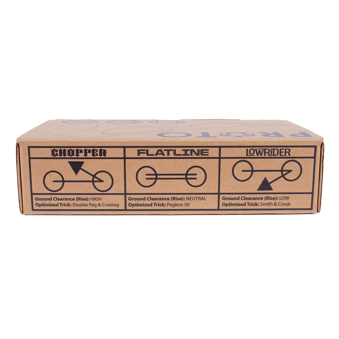 All Models feature engravings of the Model Name, Headtube Angle, Patent Number, USA and PROTO logo and hand stamped with their model-specific production number at time of final QC inspection and packaging.